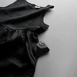 Mid length, sleeveless, back neck button fastening, concealed bindings, gathered at waist seam, side seam pockets